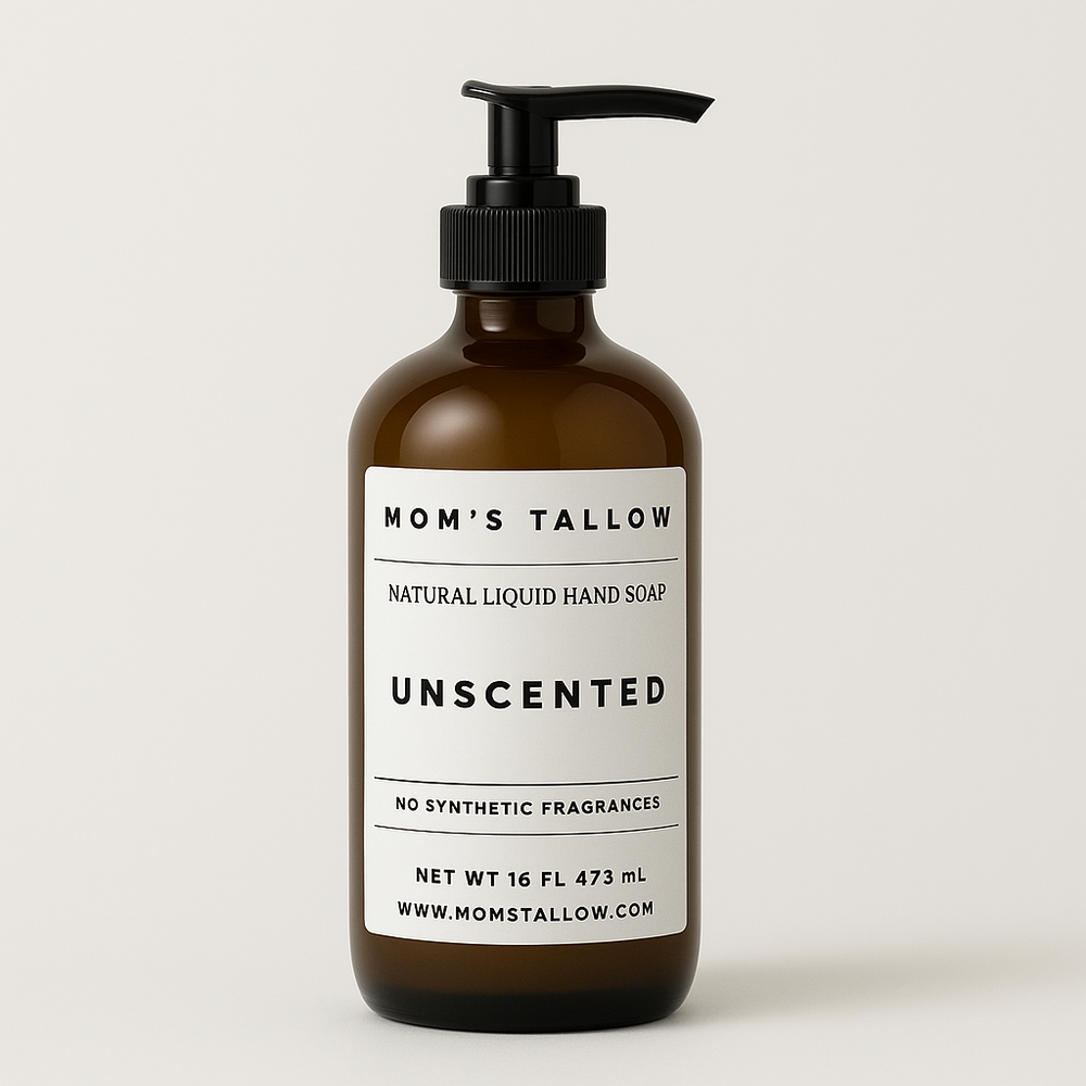 Mom’s Tallow Natural Liquid Hand Soap is a rich, moisturizing formula made with organic oils and grass-fed tallow to cleanse without stripping your skin. Handcrafted in small batches, it delivers a creamy lather and a soft, hydrated finish—perfect for daily use on even the most sensitive skin.